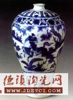 高44.1厘米,口徑5.5厘米。造型端莊,胎質(zhì)細(xì)膩,通體繪有青花紋飾:雜寶及纏枝西番蓮繪于肩部;下部繪著卷草紋;瓶子的正中,畫的是“蕭何月下追韓信”人物故事及梅花、竹子、松樹、芭蕉、山石等紋樣。瓶上,蕭何心急如焚,快馬揚(yáng)鞭;老艄公用槳撐船,疑惑不解地看著待渡人韓信;而牽著馬的韓信耷拉著腦袋躊躇岸邊,進(jìn)退兩難。