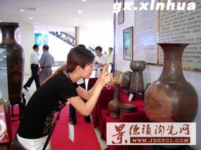 5月25日,在廣西欽州市物流產(chǎn)品展示會上,一位游客給坭興陶制作的花瓶音響拍照。