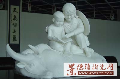 這件名為《蹉跎歲月》的陶瓷作品(如圖),雕塑的是一位背著挎包,系個(gè)“共大”草帽,坐在牛背上,諄諄善誘地教山村牧童讀書識字的女知青形象,在于謳歌當(dāng)年廣大上山下鄉(xiāng)知識青年把文化知識帶到農(nóng)村、利用各種條件傳播文化知識掃除文盲的光輝業(yè)績。