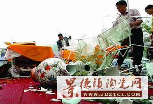 約十分鐘后,冰雹過去。曹松貴發(fā)現(xiàn)自家展示的200件瓷器已經(jīng)無一完好。他還拿出了一只叫價(jià)12萬元的雙鳳瓶給記者看,這只精致的花瓶已經(jīng)只剩瓶身,瓶口和瓶頸都被砸得粉碎。與他一起參展的80多家商戶幾乎每家都有這種“缺胳膊少腿”的瓷器。