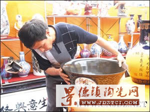 在一個(gè)展臺(tái)上,有一件標(biāo)價(jià)9.8萬元的“十二生肖”瓷瓶。該展臺(tái)負(fù)責(zé)人說,此展品是著名的瓷器藝人胡小平近期惟一的作品。然而,當(dāng)記者還價(jià)到8000元,他就松口賣了。記者要查驗(yàn)該瓷器是否真品時(shí),這位老板拿出了胡小平的名片,并再次申明這絕對(duì)是胡本人的作品。當(dāng)記者致電胡小平時(shí),胡開口就咬定那件作品是他的。記者問他怎么知道就是你的作品呢?胡啞口無言。該展臺(tái)另一負(fù)責(zé)人說,每個(gè)人的作品都有自己的特色,大師通過聲音也能判斷出來的。難道胡大師在千里之外聽出了自己的瓷器?然而,記者用手機(jī)與他通話時(shí),并沒人敲打該瓷器。