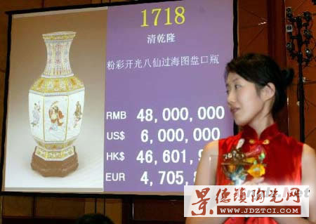 昨天,在北京舉行的“中國嘉德二○○六春季拍賣會”瓷器工藝品專場中,一件名為“清乾隆粉彩八仙過海圖盤口瓶”的瓷瓶經過激烈競拍,最終以五千二百八十萬元人民幣(含傭金)的天價成交,創(chuàng)造了中國內地瓷器拍賣的最高紀錄。