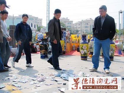 約15分鐘后,記者趕到事發(fā)現(xiàn)場(chǎng)。在宜欣廣場(chǎng)西側(cè)的空地上,記者發(fā)現(xiàn)滿(mǎn)地都是瓷器碎片,數(shù)名面色凝重的中年男子正在收拾瓷器殘片,其中一位姓江的中年男子告訴記者,2006年11月底,60家景德鎮(zhèn)瓷器經(jīng)銷(xiāo)商通過(guò)一位中介商,把上萬(wàn)件陶瓷制品千里迢迢從江西運(yùn)到?趤(lái)銷(xiāo)售,但沒(méi)有想到市場(chǎng)如此蕭條,至今2個(gè)多月過(guò)去了,瓷器沒(méi)有賣(mài)出幾件,錢(qián)卻花了不少,大家一時(shí)沖動(dòng)就當(dāng)街摔砸瓷器來(lái)出氣。