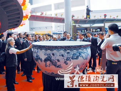 由景德鎮(zhèn)龍鳳陶瓷文化發(fā)展公司出品的“盛世名花”青花陶瓷大缸,10月18日正式在瓷博會開幕式上亮相。該瓷缸直徑1.66米,高0.8米,由景德鎮(zhèn)陶瓷技師余鵬飛手工拉坯、河北著名畫家、“中國牡丹王”崔廷玉繪畫,堪稱當今世界之最。