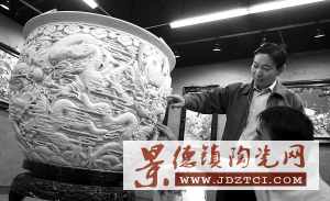 市民在展覽館內參觀陶瓷作品《浮雕龍缸》。昨日,記者在良致尚美術館看到,500多件顏色各異、造型精致的景德鎮(zhèn)瓷器吸引了大批愛好者入館欣賞。此次展出包括了曾獲中國中青年陶藝家收藏精品大賽金獎的作品《浮雕龍缸》等一批名家力作。