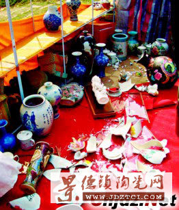 下午2時30分,記者接到熱線電話后迅速趕到陽泉北山公園。數(shù)名瓷商對著一地瓷器碎片欲哭無淚。瓷商夏先生說:“我們39家瓷商4月1日從景德鎮(zhèn)來到陽泉,托運來滿滿8車瓷器。今天突然一陣大風(fēng),4家瓷商的30多件高檔瓷器全被刮倒摔碎了!贝缮虃円贿吔邮懿稍L,一邊將自家“幸免”的瓷器從貨架上搬到地上,采取加固措施,齊胸、齊腰高的瓷瓶都被放倒在地。