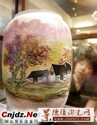 7月31日,觀眾欣賞景德鎮(zhèn)陶瓷藝術品《江灣秋韻》