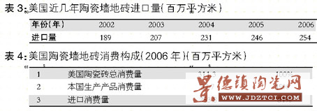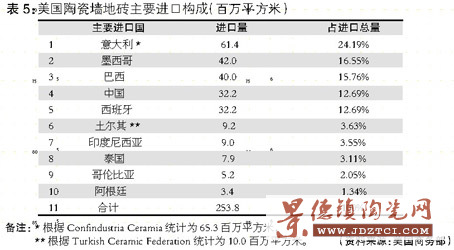 2006年美國從世界各地進(jìn)口的各類陶瓷磚總量為254百萬平方米,相比于2005年增長3.2%,占2006年全球進(jìn)口量的13.8,占2006年全球消費(fèi)量的3.4%,美國是全球陶瓷墻地磚進(jìn)口量最多的國家!