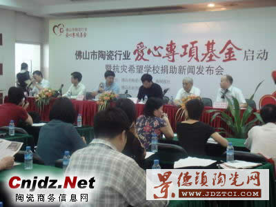 2008年6月3日下午,由佛山陶瓷行業(yè)協(xié)會(huì)、陶城報(bào)社共同主辦的“佛山市陶瓷行業(yè)愛心專項(xiàng)基金啟動(dòng)暨抗災(zāi)希望學(xué)校捐助新聞發(fā)布會(huì)”在中國陶瓷城四樓會(huì)議廳隆重舉行。