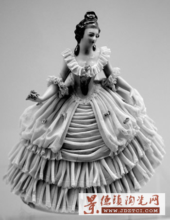 如今,歐洲瓷器與中國瓷器已經(jīng)長成完全不同的兩棵大樹了。中國歷史上的瓷器大多造型簡潔、用色單一,而歐洲瓷器造型寫實、色彩豐富,瓷器的用途也被擴展到許多裝飾及實用物品上,包括照明、書寫工具和家具等。張嵐說:“這次展出了不少歐洲藝術(shù)瓷,在中國瓷器史上很少見!彼钢蛔霎a(chǎn)于德國德累斯頓的人物造型瓷說:“這個作品追求寫實的藝術(shù)風(fēng)格,人物身上的紗裙,是把絲織物放進瓷土中燒制而成,遠看和真的紗裙一樣,其實質(zhì)地是瓷器,這種工藝是當(dāng)時的中國所沒有的!