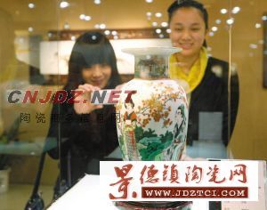 在該展展出的作品中,有很多是藝術家私人珍藏的精品,還有些是在拍賣行進行競拍的作品。這些作品涵蓋了各種工藝,比如張松茂的粉彩山水,李進的粉彩瓷板,陸如的青花瓷瓶等,傳統(tǒng)工藝與創(chuàng)新工藝同臺展示,爭相斗艷。該展的最大亮點,可謂是中國工藝美術大師戴榮華帶來的兩件古彩作品,一件是2007年曾經(jīng)拍賣過的《紅葉傳情》,另一件是他去年創(chuàng)作的古彩精品《人面桃花相映紅》。這兩件作品色彩鮮艷,線條剛勁,構圖圓滿,充滿了濃郁的中國民族藝術之美,十分引人注目。