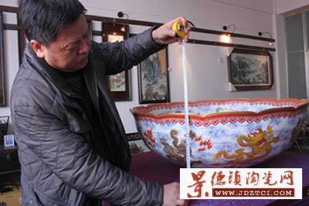 在工作人員的燈光展示下,記者看到,大碗內(nèi)側(cè)的龍與外面的龍相對應(yīng),在燈光下映襯出一條龍,大碗的正中一條龍,與碗壁的龍相輝映,繪制精妙,氣勢磅礴,艷麗絕倫,其手法和意境令人嘆為觀止。
