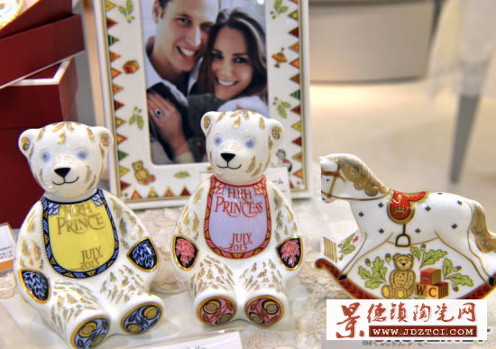 當?shù)貢r間2013年7月17日,日本東京,高島屋百貨公司,英國皇冠德貝瓷柜臺的員工展示王室寶寶紀念餐具和瓷器擺件。