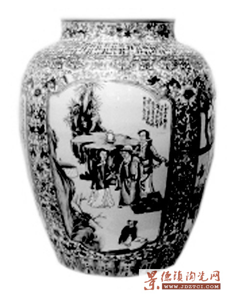 五彩瓷有兩種,一種是青花五彩,一種是純釉上五彩。青花五彩瓷是先在釉下用青花描畫出所繪圖案的藍(lán)彩部分,罩釉燒成,然后再在其余部分按圖案要求繪彩,再放入爐中進(jìn)行二次燒制,這樣一件青花五彩瓷器就算燒成了。這個(gè)壇子的繪畫和畫面以外的青花紋飾部分即是。嘉靖、萬歷時(shí)期五彩瓷比較多見。嘉靖至明末清初,民窯開始大量生產(chǎn)五彩瓷器。民窯五彩青花作品的圖案一般說來比官窯的要豐富,有神獸、花木奇石、人物山水等,生活氣息比較濃厚。其色彩主要是紅、綠、藍(lán)、黃,這四種顏色在這只瓷壇的畫面上搭配得恰到好處。