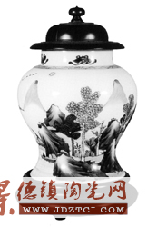 將軍罐,因罐蓋形似古代軍士的頭盔而得名。元代已有,康熙時(shí)將渾圓的罐體展肩提腹,拉長(zhǎng)脛部,收緊圈足,使之豐肥中見(jiàn)勁瘦,挺拔向上,氣魄宏偉。康熙時(shí)期制瓷技術(shù)提高,對(duì)泥料的淘洗程度較明代要復(fù)雜得多,使康熙時(shí)期的瓷質(zhì)達(dá)到了粉白的程度。此罐高23厘米,繪有山水,在口沿繪有雜寶。青花渲染充分,達(dá)到了色分五彩的藝術(shù)效果。