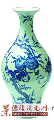 此瓶造型輕盈秀麗,靈巧俊雅,紋飾吉祥,具有很高的繪畫技巧,以竹喻祝,以蝠喻福,寓意五福臨門。以桃喻意長壽,而桃的數(shù)量為九,則是數(shù)字中的至高數(shù),喻意使用者至高至尊的地位。以此祝賀福壽雙全,寓意靈仙祝壽與五福捧壽。