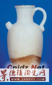 圖為唐代白釉執(zhí)壺,高23.5厘米,口徑5.3厘米,足徑6.5厘米。壺為廣口,短流,餅形平底,柄連接于口,壺身修長,造型規(guī)整,形體豐滿,健實大氣,胎體厚實,胎色灰白,質(zhì)地粗松,白色化妝土和釉不及底,施釉不均勻。略有漏釉現(xiàn)象,釉色乳白,聚釉處呈閃乳黃色。釉層開片不均勻,光澤溫潤,腐蝕痕跡明顯,柄接連處胎骨有窯裂,邊沿處剝釉明顯,下部胎質(zhì)嚴重脫落,另外,在柄身下垂處柄尾上添加一小塊類似紐扣(帽釘)的堆貼裝飾,這可能是古人從服裝上得到啟發(fā),效仿將工體牢牢扣在一起。綜合分析,筆者認為此壺應(yīng)是唐代邢窯的粗白瓷。