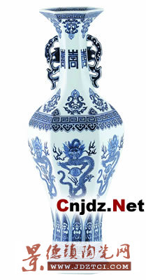 清乾隆青花龍壽紋螭耳六方瓶是乾隆皇帝喜愛之物,曾傳旨稱贊:“此尊花樣,款式甚好”。它高57.4厘米,口徑14厘米,足徑15厘米。瓶呈六方形,撇口,直頸飾對稱螭耳,斂腹,圈足外撇。青花紋飾,口沿飾回紋,頸上下對稱飾如意云頭及變形蓮紋,中間寫篆書“壽”字,腹繪正面龍抱篆書“壽”字寶珠,肩、足墻皆飾回紋,近足處繪變形蟬紋、螭紋和聯(lián)珠紋。底青花書“大清乾隆年制”六字篆書款。