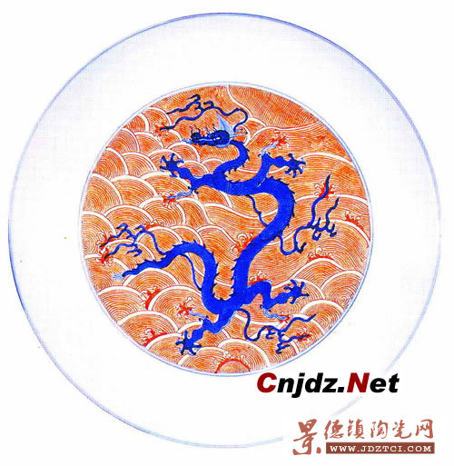 明代釉上紅彩始于洪武,但數(shù)量極少。在清初釉上彩飛速發(fā)展的康熙期,仿制前朝各品成為景德鎮(zhèn)官窯的時尚,青花龍紅海水紋盤也在其中。