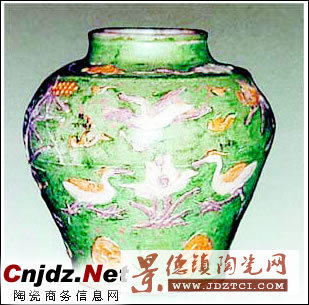 泰州博物館藏有一件從明代墓葬中出土的素三彩堆塑雁紋瓷罐,這件三彩罐高15.1厘米,口徑7.l厘米,底徑9.2厘米,唇口微外翻,短直頸,鼓腹,下腹?jié)u收,近底處稍外撇,平底,細(xì)白胎,腹部有一圈胎接痕,最大半徑偏于上部,顯得圓潤豐滿。罐內(nèi)部施白釉,外部滿刷草綠色釉,罐身堆塑黃、紫、白三色釉裝飾的蘆雁、云彩、蓮花等圖案。從造型、胎接工藝及紋飾分析,應(yīng)為明代中晚期景德鎮(zhèn)的產(chǎn)品。