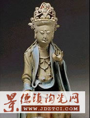 觀音作坐勢(shì)。頭戴寶冠,以結(jié)跏坐于蓮座之上,身著廣袖低領(lǐng)外衣,坦胸,面目豐腴,耳后有長(zhǎng)發(fā)披于肩。手指細(xì)長(zhǎng)。左手下垂撫于膝,右手上舉,做說(shuō)法狀。瓷質(zhì)細(xì)白堅(jiān)致。大部露臺(tái)素?zé)瑑H在衣襟、袖口、胸前等處施青白釉,釉色淡青,聚釉處為水綠色。在露胎的寶冠、衣裙等處飾以綠彩。惜大部以剝落。塑像底部有墨書題記,楷書"大宋淳祐二十一年辛亥"(公元1251年)九字清晰可辨。