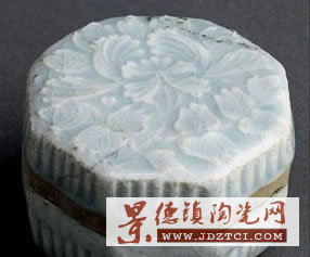 八邊棱柱形,盒面平整,上印盛開的折枝牡丹花。盒邊飾縱線條:蓋邊為一周寬素邊。內(nèi)有一內(nèi)凹小層蓋:可以分層裝盛,亦可防漏氣走香。此盒小巧玲瓏,胎細(xì)釉潤,制作工細(xì)。