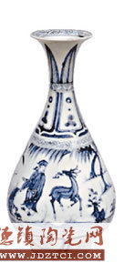 該青花人物紋玉壺春瓶制于元代,高30厘米、口徑8厘米、底徑8.8厘米。玉壺春瓶是元代盛行的器形,基本沿襲宋代制式,但較宋代顯得厚重飽滿。該器物撇口、細(xì)長(zhǎng)頸、廣圓腹、圈足。內(nèi)口沿繪一周纏枝花紋,頸部為蕉葉紋及如意紋,腹部主題紋飾為人物故事圖,足壁是如意紋。青花色調(diào)淡雅,用國(guó)產(chǎn)青料所制。圖案豐富,主次分明。胎細(xì)白,釉汁滋潤(rùn),白中閃青,反映元代景德鎮(zhèn)制瓷工藝水平,為國(guó)家一級(jí)文物。
