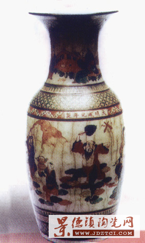 筆者懷著敬意仔細(xì)觀看了這只五彩人物敞口瓶,但見瓷瓶肚腹部畫著“八仙過海圖”,八位仙人姿態(tài)各異,均被描畫得惟妙惟肖、栩栩如生。他們各自駕著祥云,正在各顯神通,渡海而來。仔細(xì)觀瞧之下,人物之間竟畫有2只翩翩飛舞的彩蝶,煞是可人,也給人物畫面增添了幾分生活氣息,這幅“暗八仙”拍板,也被畫在人物之間,一明一暗,巧妙地點(diǎn)綴著畫面。瓶頸部畫有傳統(tǒng)題材“嬰戲圖”,天真浪漫的兒童被畫得富有生活情趣。觀賞之余,莫不感受到真是仙凡齊聚一瓶,好一幅天上人間、天人合一、共建和諧社會(huì)的完美圖景!瓶肩部寫有“大明成化年制”字樣。瓶的口部下方、頸肩部及瓶下部,畫有多圈不同花紋的紋飾,襯托著人物畫面,使這只五彩敞口瓷瓶更加顯得高貴典雅,美觀大氣。