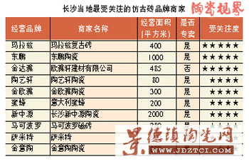 最近幾年湖南地區(qū)刮起了仿古風(fēng),消費(fèi)者對(duì)仿古磚品牌的熱度有增無減。雖然商家普遍看好仿古磚的發(fā)展前景,但長(zhǎng)沙仿古磚銷量仍下降了5%左右,常德、郴州等二、三級(jí)市場(chǎng)銷量降幅在15%左右。長(zhǎng)沙地區(qū)建陶共400家,專賣和兼營(yíng)仿古磚的商家有70家,占建陶商家的17.5%,這一比例在地市級(jí)市場(chǎng)則更高。目前長(zhǎng)沙仿古磚的專賣商家有32家,主要品牌包括:瑪拉茲、金意陶、羅馬利奧、樓蘭、陶藝軒、雅士·高夫。長(zhǎng)沙仿古磚品牌眾多,可選性強(qiáng),競(jìng)爭(zhēng)也較為激烈。