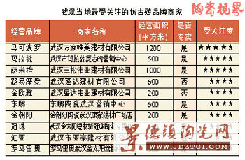 武漢市場(chǎng)上經(jīng)營(yíng)仿古磚的商家占到了所有建陶商家的60%以上,但真正有實(shí)力的仿古磚商家并不多,甚至還有很多商戶一直靠“炒貨”生存。不過,像馬可波羅、瑪拉茲、金意陶等以仿古磚經(jīng)營(yíng)為主的專賣店,在武漢市場(chǎng)上還是比較受歡迎的。但由于雜牌、低檔次仿古磚對(duì)市場(chǎng)有一定的沖擊作用,消費(fèi)者廣泛接受仿古磚還需時(shí)日。