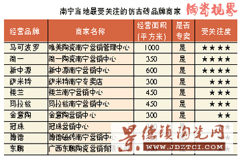 目前,南寧消費(fèi)者開始逐步接受仿古磚。據(jù)抽樣調(diào)查數(shù)據(jù)顯示,南寧仿古磚銷量基本與去年持平,二、三級(jí)市場(chǎng)上升幅度在10%左右。仿古磚尤其被80后年輕人所青睞和追捧,作為年輕人裝修的首選產(chǎn)品,仿古磚的市場(chǎng)需求也越來越大。在市場(chǎng)內(nèi)需的拉動(dòng)下,目前南寧經(jīng)營(yíng)仿古磚經(jīng)銷商已有30多家。主要品牌有:瑪拉茲、金意陶、馬可波羅、簡(jiǎn)一、羅馬利奧 、樓蘭、陶藝軒、圣·凡爾賽、上元山河、薩米特、奧米茄、榮高、金朝陽(yáng)、新里萬(wàn)、陶一郎、歐盟尼魔方磚、馬可新地、冠珠、宏宇、嘉俊等20多個(gè),品牌集中化程度逐步提高。