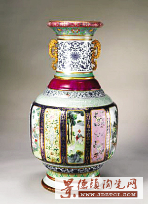 清代乾隆時(shí)期的景德鎮(zhèn)御窯廠,在乾隆皇帝好古追奇的驅(qū)使下,聚集了一大批能工巧匠,再加上督陶官唐英的苦心經(jīng)營,各種新奇靈巧的制品層出不窮。這件素有“瓷母”美稱的各種釉彩大瓶,體現(xiàn)了當(dāng)時(shí)制瓷工藝的登峰造極,傳世僅此一件。