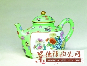 | 清 乾隆款綠地粉彩開光菊石紋茶壺 |