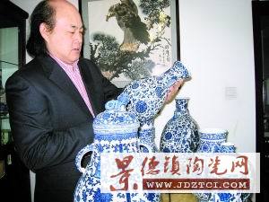 “青花瓷有著濃郁的東方味、中國味,有自己獨(dú)特的藝術(shù)語言。它運(yùn)用寫意的手法,通過對‘似與不似之間’的演繹,詮釋著中華民族獨(dú)特的審美情結(jié)。”與青花結(jié)緣數(shù)年的吳進(jìn)良談起青花瓷來如數(shù)家珍。“我之所以鐘愛青花瓷,實與我本人從事繪畫藝術(shù)有關(guān)。一個熱愛藝術(shù)的人,應(yīng)該善于發(fā)現(xiàn)現(xiàn)實中美的東西、讓你心動的東西。青花瓷之所以吸引我,首先在于它具有兼收并蓄的繪畫意境美。白底藍(lán)花,靜靜佇立,像美麗的仙子,讓人感覺到一種生命的激情和律動;它的白,也不是單純的白,而是白里泛青,猶如玉脂,看似簡練卻有不動聲色的奢華;用色單一卻不單調(diào),濃濃淡淡、疏疏密密、有深有淺、有粗有細(xì),于一白一藍(lán)間,幻化出無窮的神奇?梢哉f每一種青花紋樣,都是一幅中國水墨畫。此外,青花瓷蘊(yùn)含了中華民族獨(dú)有的人文精神美,與我國傳統(tǒng)詩詞、書畫等文學(xué)藝術(shù)一樣,青花瓷富有鮮明的民族特色和深厚的文化底蘊(yùn)。