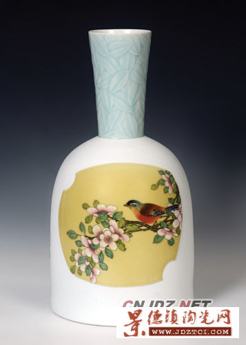 崔迪把傳統(tǒng)作為很好的資源,重新認識和深度挖掘。這些作品主要以珍珠白釉為底釉,在瓷瓶頸部或邊緣刻上淺浮雕花紋,瓶身中間顯著部位以黃釉的開窗形式裝飾,開窗部分則以粉彩花鳥來表現(xiàn)。傳統(tǒng)陶瓷裝飾的開窗也叫“開光”,或稱“開斗方”。它是區(qū)別于傳統(tǒng)造型中的通景處理方式而得名的,主要在花鳥瓷畫中表現(xiàn)一種折枝小景的布局方式,使畫面顯得精致雅氣。