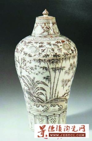 釉里紅歲寒三友紋梅瓶是現(xiàn)存的唯一一件帶蓋子而且保存完整的洪武釉里紅梅瓶,于1993年被國家文物局鑒定為國寶級文物。