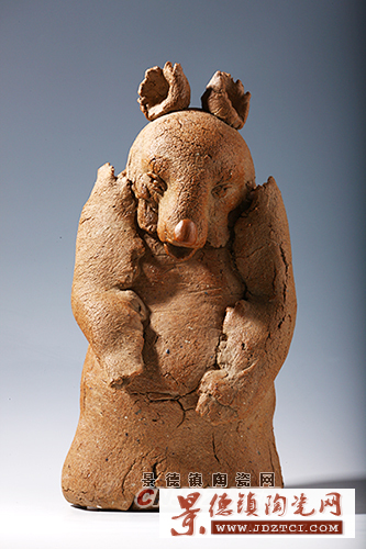 在充分挖掘泥條盤筑法之現(xiàn)代藝術(shù)表現(xiàn)力的同時(shí),周國楨也對泥餅卷筒成型法進(jìn)行了探索,同樣取得了巨大成功。與泥條盤筑法一樣,泥餅卷筒法也是彩陶文化時(shí)期即已存在的一種非常古老的陶瓷成型技法,而且在中國陶瓷界一直都在沿用,如江蘇宜興制紫砂壺就多用泥餅卷筒法 。同樣,泥餅卷筒成型技法,不僅能使作品自然形成便于窯燒的中空結(jié)構(gòu),而且能夠有效發(fā)揮泥土的可塑性,還可以根據(jù)需要?jiǎng)?chuàng)作成各種肌理效果,其天然的泥味和殘缺美正是現(xiàn)代陶藝所追求的自由、奔放、隨意、大氣、返璞歸真的重要品格和造型語匯。周國楨泥餅卷筒法的代表作有《猶豬》(1989年)、《野豬》(1989年)、《任重道遠(yuǎn)》(1997年)、《森林怨》(1998年)、《吶喊》(1999年)、《大猴王》(1999年)、《靜觀》(2000年)、《老長工》(2000年)、《河馬》(2003年)、《羚羊》(2004年)、《指手畫腳》(2007年)、《有喜了》(2007年)、《喜來了》(2007年)等等。