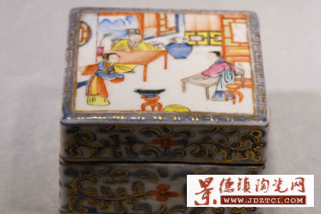清代的“青花描金粉彩人物故事紋印盒” 整體造型規(guī)整,正面繪有人物場(chǎng)景,周身描金回紋,優(yōu)雅華貴,底部及內(nèi)部均為松石色釉面,整體畫工細(xì)膩,釉色純正,胎質(zhì)一流。