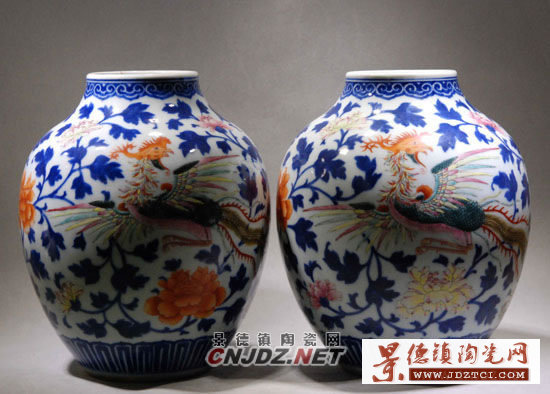 清嘉慶“青花暗刻粉彩鳳穿花卉紋罐”所施色彩濃重鮮艷,雖紋飾滿密,但主題鮮明。直口,短頸,豐肩,鼓身,收足。胎體厚實(shí),造型規(guī)整,通身施白釉,釉面光滑,包漿古樸。頸上繪如意紋,肩上環(huán)飾青花枝葉紋,腹部滿飾,周身暗刻鳳紋,以五彩繪雙鳳穿花圖紋,相輔相成。鳳身扭轉(zhuǎn),羽翼張開(kāi),姿態(tài)曼妙,自由飛舞在花間,鳳身翎羽詳細(xì)描繪,筆法灑脫,釉色艷麗,點(diǎn)綴幾朵富貴牡丹,高雅脫俗。