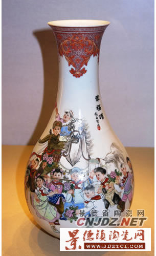 這件瓷瓶所繪“幸福頌”圖,描繪了12個身著少數(shù)民族服裝的小朋友,他們載歌載舞,簇擁著1名披著斗篷、拉著戰(zhàn)馬的志愿軍戰(zhàn)士,場面熱烈而壯觀。留白處題“幸福頌”三字,落“彭兆賢作”墨書款,鈐紅彩篆書章“印”字。作品上人物眾多,刻畫生動,色彩豐富,既充分展現(xiàn)了祖國少年兒童對志愿軍戰(zhàn)士的熱愛之情,也從一個側面反映了全國各族人民珍視幸福生活、熱愛世界和平的美好心愿。