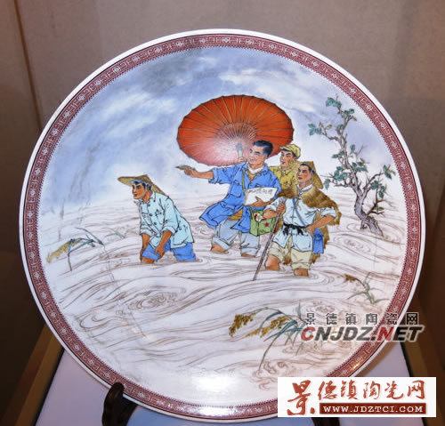 這件瓷盤所繪畫面以寫實(shí)的技法描繪了焦裕祿同志冒著瓢潑大雨,帶領(lǐng)群眾察看洪水流勢(shì)的情景。畫面上的焦裕祿右手拿筆,左手夾著洪水流向圖資料,身背裝有“老三篇”(即毛澤東寫的三篇短文:《為人民服務(wù)》《愚公移山》《紀(jì)念白求恩》)的軍挎包,鎮(zhèn)定自若地指揮著抗洪工作。作品樸實(shí)無華,但卻傳遞出一種鼓舞人心的力量,給人以心靈深處的啟迪與思考。
