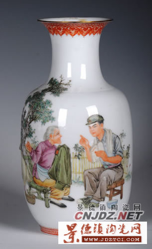 這件瓷瓶所繪畫面以籬笆院為背景,描繪了軍民互助的感人場面。庭院里,一名中國人民解放軍戰(zhàn)士拿著毛主席語錄,正在講給老奶奶聽,老奶奶則一邊聽著一邊縫補(bǔ)軍服,表現(xiàn)了人民軍隊(duì)植根于人民之中,軍民親如一家的密切關(guān)系。