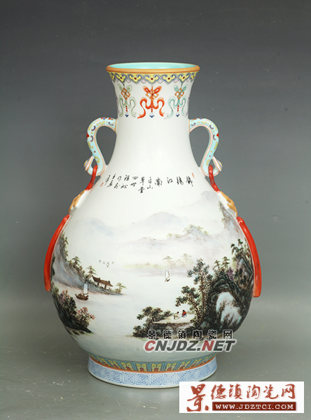 縱觀幾代“汪派山水”,不難發(fā)現(xiàn)“汪派山水”繼承了中國(guó)傳統(tǒng)文人畫中的品位。講究融詩(shī)、書、畫于一體,由作者本人書畫并題。作品意境深遠(yuǎn),色彩淡雅,以景傳情,具有強(qiáng)烈的感染力。因此能表現(xiàn)作者主觀思想志趣與審美觀念,突出個(gè)人的創(chuàng)作風(fēng)格與個(gè)性。也能體現(xiàn)作者的文化藝術(shù)修養(yǎng)和哲學(xué)思想。山水創(chuàng)作將國(guó)畫的皴、擦、暈、染等技法融入瓷畫創(chuàng)作,通過(guò)陶瓷這個(gè)載體表現(xiàn)個(gè)人思想情感和審美旨趣,這完全有別于傳統(tǒng)山水的勾線填色和富麗重彩,而顯得清雅脫俗,個(gè)性風(fēng)格突出,使作品有很高的文化內(nèi)涵和藝術(shù)價(jià)值,這是以往景德鎮(zhèn)的傳統(tǒng)彩繪藝人所不具有的。在造型藝術(shù)方面,適應(yīng)陶瓷花瓶等圓形器皿彎曲轉(zhuǎn)折的特點(diǎn),巧妙布局,別具匠心地始創(chuàng)難度很高的通景山水,使陶瓷作品在各個(gè)角度看都是完整的畫面,又可以連續(xù)轉(zhuǎn)動(dòng)觀賞,將國(guó)畫山水長(zhǎng)卷的神韻融入其中,而陶瓷造型特色,又使之具有首尾相連,循環(huán)往復(fù)的動(dòng)態(tài)美。在設(shè)色方面,既不同于古彩的單調(diào)、刻板、艷俗,又比淺絳彩豐富,富于表現(xiàn)力。