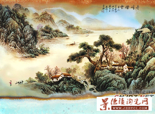 汪野亭以青綠山水影響巨大。以國(guó)畫融入陶瓷中,這在山水題材上難度更大,因?yàn)橛粤显?a href="http://qasw37.cn" target="_blank">陶瓷繪畫中不像水墨在宣紙上那樣容易揮寫皴染,這就限制了瓷上山水的表現(xiàn)形式。汪野亭先生開拓創(chuàng)新,別開生面地將國(guó)畫山水繪畫的神韻融入陶瓷創(chuàng)作中,使瓷山水達(dá)到一個(gè)新的高度。在結(jié)合的過(guò)程中,不僅對(duì)景德鎮(zhèn)傳統(tǒng)的彩繪工藝進(jìn)行了一系列的改革,而且也對(duì)傳統(tǒng)“文人畫”作了一些內(nèi)容和形式上的調(diào)整。