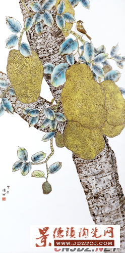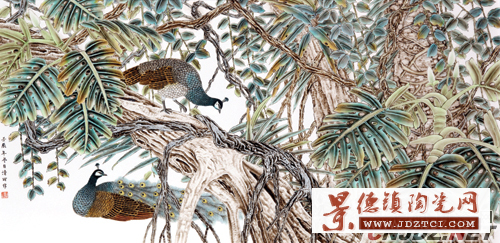 清麗近年之陶瓷畫,多為熱帶雨林景象。行走于版納叢林之中,她思考著寫生的意義,尋找有限之形以外的東西,用心去感受去創(chuàng)造自然界最真實的自然之美。對于工筆花鳥而言,寫實的功底固然非常重要,然而傳達形象之外的精神氣質(zhì),表達內(nèi)心與宇宙同一的律動,是清麗的藝術(shù)追求。滿眼繁華景象,然而也許終是幻影,于是般般放下,如同畫面的定格,如同音樂的流轉(zhuǎn)。因此,觀她的陶瓷繪畫,雖然是工筆,卻頗有寫意的輕松。鄒小山云“以萬物為師,以生機為運,見一花一萼,諦視而熟察之,以得其所以然,則韻致風采,自然生動,而造物在我矣”!霸煳镌谖摇币粍t摻雜畫家對生活的真實感悟,一則在于對畫面、媒介的個性把握,形成她獨到的觀察和表達世界的方式。