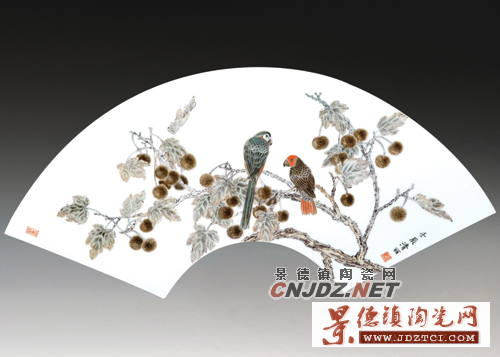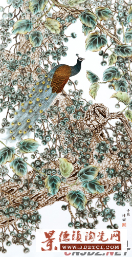 觀清麗的粉彩陶瓷花鳥是一種視覺享受。她筆下的花鳥世界,色澤粉潤柔和,細膩豐富。既見夏花之爛漫,亦有冬景之蕭瑟,傳情達意,不止乎于形。粉彩瓷板畫《雨林之樂》,清朗的天空下,繁茂的熱帶雨林生機勃然,仿佛置身其中,似可聆聽到禽鳥的鳴唱,“絲管啁啾空翠來”,這自然的美景,又何嘗不是一曲生命的樂章。畫面中藤蔓曲折環(huán)繞,脈絡(luò)細節(jié)纖毫畢現(xiàn),而巧妙的穿插安排卻使畫面呼吸暢通、節(jié)奏明朗不擁擠拖沓,氣度渾然而細節(jié)處見娟秀!抖翢o聲》頗得宋人雪景翎毛的法度意趣,又參以明代花鳥之恢宏景象,遠景渲淡,空蒙彌漫,近景雙鉤,細致入微,細節(jié)處一絲不茍,富有感染力。《秋風掠影》表現(xiàn)風起的瞬間景象,造型生動,物象相互呼應(yīng),富有動感卻不失井然之序,色澤淡雅明快。《山花爛漫》截取折枝入畫,構(gòu)圖老到,簡中見繁,活潑靈動。她的粉彩主要探索點染、洗染、撞色等技法的運用,色墨交融,清新明麗,富有韻味。