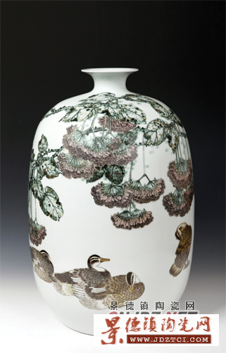 談及陶瓷創(chuàng)作,清麗直言不得不面臨一個問題:畫畫得很好,但陶瓷卻不一定畫得好。工筆繪畫運用在陶瓷材料之上,首先對于陶瓷媒介的掌握需要時間的摸索與積累,尤其是陶瓷花瓶的構(gòu)圖跟國畫宣紙的構(gòu)圖也是兩種不同的思維理念,得花心思去研究才行。尤其粉彩,從打料勾線到點染填色,工藝非常之繁復(fù)需要大量的實踐摸索。清麗的陶瓷作品中,可見她的匠心獨運,能看得出她對于筆底形象如何適應(yīng)陶瓷媒介的思索,尤其是在結(jié)合瓷器的器形,表現(xiàn)層次疏密的關(guān)系。青花斗彩《雨林之歌》,瓶肩部的物象的飽滿與瓶身下方留白的對比,打破橢圓型器形的凝重刻板,而顯得輕松明快!洞髽洳ぬ}》瓶頸的素潔與瓶身的繁密,滿而不塞,繁而不堵,形成典雅端莊又獨具個性的巧趣。在陶瓷媒介表現(xiàn)探索里兜兜轉(zhuǎn)轉(zhuǎn)之后, 清麗越來越自信找到自己的目標和方向了,從她的畫面內(nèi)容中可以讀出她對于陶瓷繪畫表達已頗有心得。