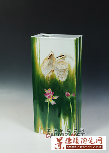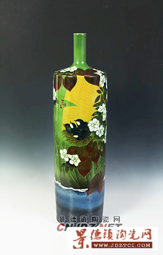 景德鎮(zhèn)的顏色釉瓷器歷史悠久、品種繁多,色彩繽紛,馳名中外。馮雪迎勤于陶瓷創(chuàng)作,精于器型的塑造,并專于色釉綜合裝飾的研究和創(chuàng)作。色釉綜合裝飾在技術(shù)、手法上的要求較高,馮雪迎的作品主次分明,品種繁多且變幻莫測,其工藝性很強的設(shè)計方法大都要求把握住裝飾的總體效果,不必拘泥于細小局部,同時也要運用一些半流動或不流動的色釉畫底,進行局部刻畫,使其渾然一體,既流動性好、自然,又不至面貌全非,在色釉的分布搭配上也照顧了器型和釉料的特點。要做好色釉綜合裝飾不單是要具備一定的藝術(shù)修養(yǎng),更重要的是熟透工藝,用顏色釉裝飾陶瓷才能得心應(yīng)手。她充分的利用顏色釉的自然天成,并巧妙構(gòu)思,使色釉斗彩作品渾然天成,作品即可美化人們的生活,又能夠陶冶人們的情操。