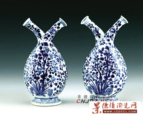 展覽中有一對清康熙時期的青花果樹紋油醋瓶,它是以歐洲的玻璃器皿為原型燒造而成。瓶頸部兩管交叉,腹內(nèi)一分為二,互不相通,一半裝橄欖油、一半裝醋,往外倒醋時油不會出來,往外倒油時醋不會出來,可謂一器二用,設(shè)計構(gòu)思非常巧妙。