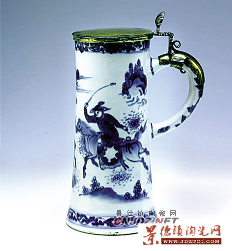 這件明末的杯子是按照西方客戶的要求定制的,是歐洲常見啤酒杯的造型。杯子以青花裝飾,內(nèi)容為獵鹿圖,一手持皮鞭的騎馬男子正在追趕著一頭鹿,鹿慌不擇路地向前逃竄,畫面充滿著動感。在歐洲造型的器物上,以中國的繪畫技法表現(xiàn)的中國傳統(tǒng)題材內(nèi)容,在17世紀(jì)較為流行,對于西方市場來說,異域風(fēng)格的內(nèi)容,更吸引人。杯子有銀質(zhì)蓋,這是在歐洲銷售以后,客戶按照自己的審美要求,由歐洲銀匠制作的。(以上藏品皆為上海博物館藏)